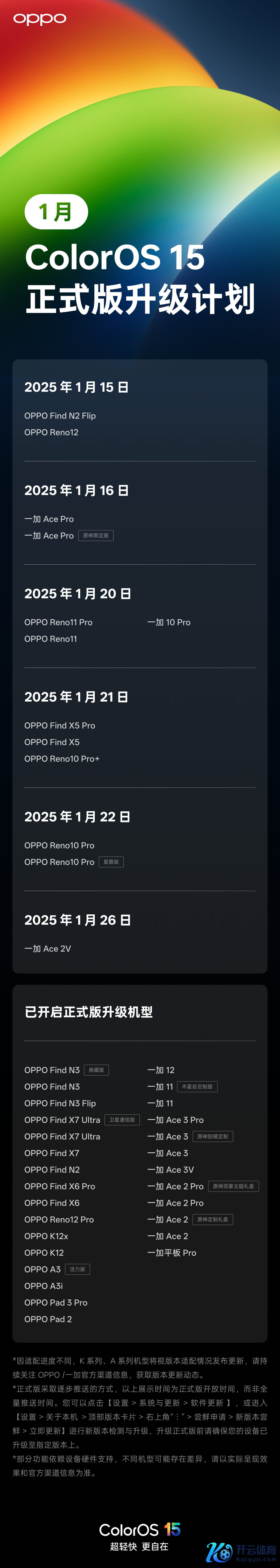 另外,ColorOS 15 郑再版 2025 年1 月升级缱绻已公布,将于 1月 15 日起绽开升级,包括 OPPO Find N2 Flip、一加 Ace 2V 等 13 款机型在列。