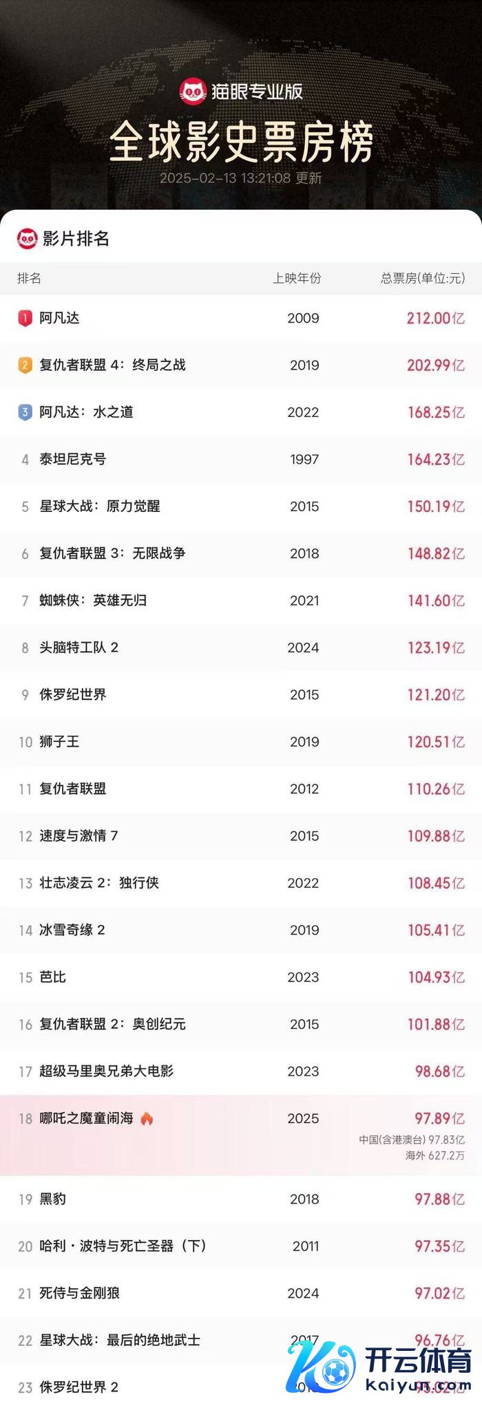 据猫眼专科版数据,《哪吒之魔童闹海》累计票房(含预售及国外票房)破97.89亿,超《黑豹》票房收货欧洲杯体育,投入内行票房榜前18,实现刻下国外票房已超627万东说念主民币。