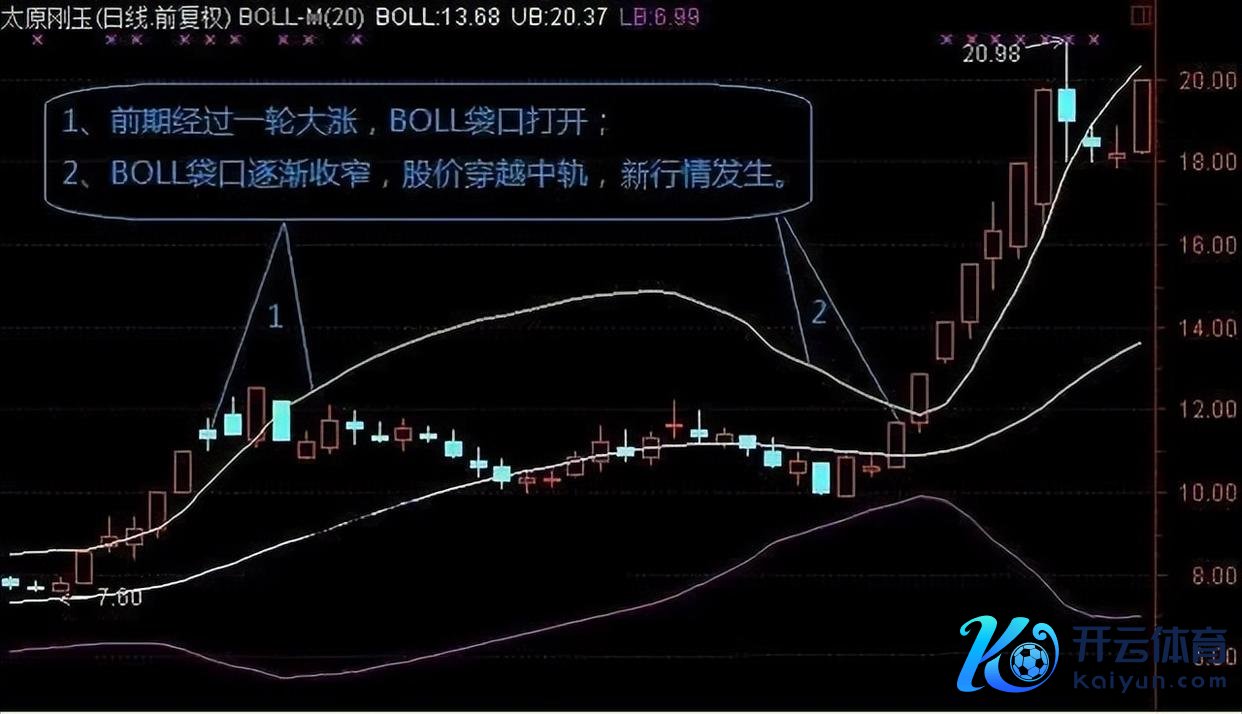 布林线的险峻轨之间的距离变化,即启齿和收口,能够为投资者提供股价畴昔走势的困难萍踪。当险峻轨渐渐变窄,也等于布林线收口时,说明股价的波动幅度渐渐减小,市集多空两边力量趋于均衡,股价行将濒临标的取舍,可能会出现较大的行情变动。这种情况就像摇风雨驾临前的安心,看似安心的湖面下实则嗟叹万千。