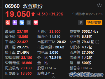 双登股份上市首日涨超31%,盘中一度涨近60%。在上一交游日中,双登股份黑市收涨83.46%,报26.62港元。公开采售阶段双登股份获3876.25倍认购,公开采售的发售股份最终数量为585.6万股股份,占发售股份总和的约10%。
