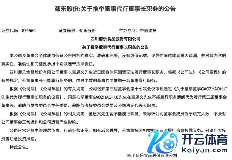 实控东说念主离世后谁来交班?7月30日,菊乐股份发布公告称,公司董事长童恩文因肉体原因暂无法本质董事长职务,笔据《公法令》《公司规章》的筹划规章,菊乐股份召开董事会审议通过议案,在童恩文不成本质职务工夫,愉快推举董事GAO ZHAOHUI代为本质菊乐股份董事会董事长、计谋与发展委员会主任委员、薪酬与窥伺委员会委员及公法令定代表东说念主责任。