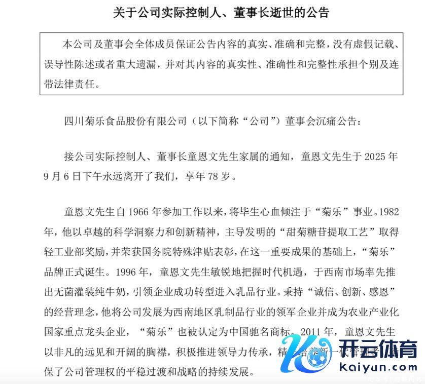 9月8日晚间,菊乐股份(874569)称接到内容戒指东说念主、董事长童恩文家属的见知,童恩文已于2025年9月6日下昼死字。菊乐股份称,公司筹划处分团队精深履职,各项筹划业务活动不会受到影响。当今菊乐官网依然变为詈骂色。